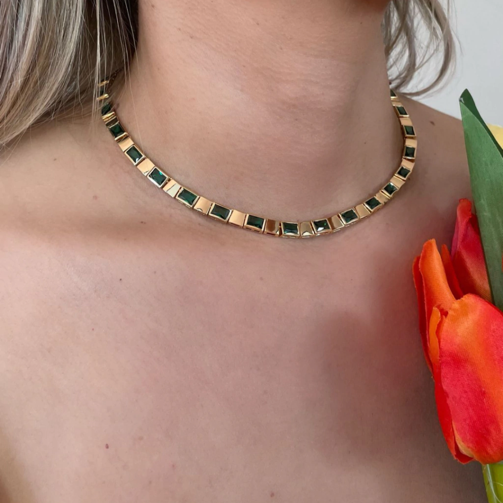 Dados Técnicos: Choker com zircinias intercaladas na cor esmeralda, com fecho de joalheria (gaveta)