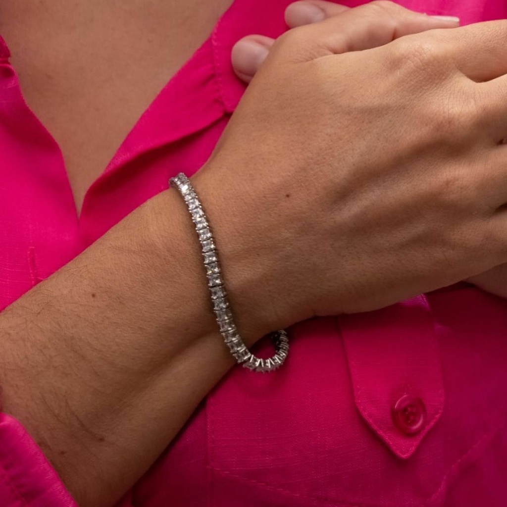 Banhada em ródio branco, essa pulseira apresenta um acabamento espelhado e refinado, com brilho semelhante ao da platina, proporcionando uma estética de alta joalheria. Perfeita para ocasiões especiais como casamentos, formaturas, eventos de gala ou para elevar looks noturnos, ela também é uma excelente opção para presentear com estilo.