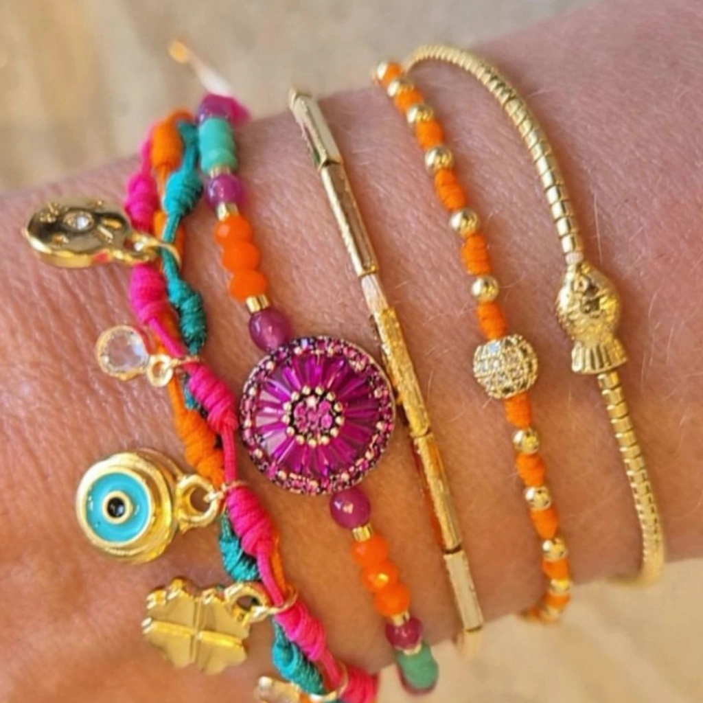 Feita com materiais leves e resistentes, é ideal para compor looks casuais com estilo e bom humor. Pode ser usada sozinha como peça-chave ou combinada com outras pulseiras para um mix criativo e descontraído.